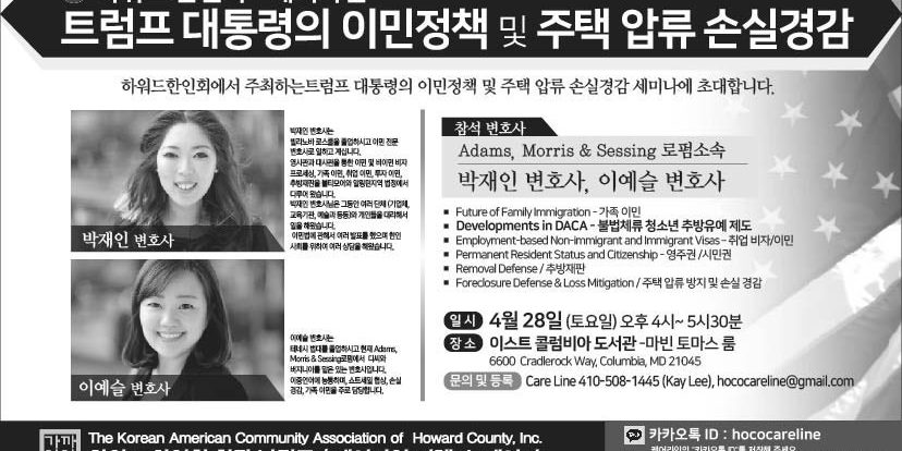일시: 7월 2일 (월), 7:00pm – 8:30 pm 장소: 엘리컷시티 밀러 도서관 (Miller Branch Library) 주소: 9421 Frederick Rd, Ellicott City, MD 21042 강사진: 한인경찰, 이원진 박사, 박대성 목사 외 문의: 410-733-3048 하원드 한인회 410-274-2720 최지훈 워싱톤한인상공회의소 사무총장 공동주최: 하원드 한인회, 워싱톤한인상공회의소