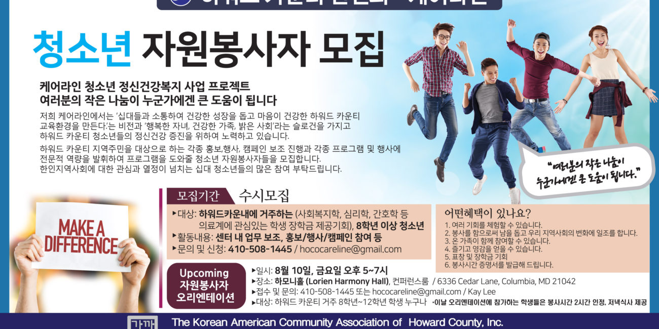 하워드한인회(회장 남정구) 부설 케어라인(디렉터 케이 리)이 10일 청소년 자원봉사자 오리엔테이션을 열고, 케어라인 프로그램과 활동 등을 소개했다. 케어라인은 하워드카운티에 거주하는 8학년 이상 청소년을 대상으로 자원봉사자를 모집, 센터 내 업무 보조와 홍보, 행사, 캠페인 등을 돕도록 할 계획이다. 특히 케어라인은 청소년 정신건강 복지 프로젝트를 통해 ‘십대들과 소통하여 건강한 성장을 돕고 마음이 건강한 하워드카운티 교육환경을 만든다’는 비전과 ‘행복한…