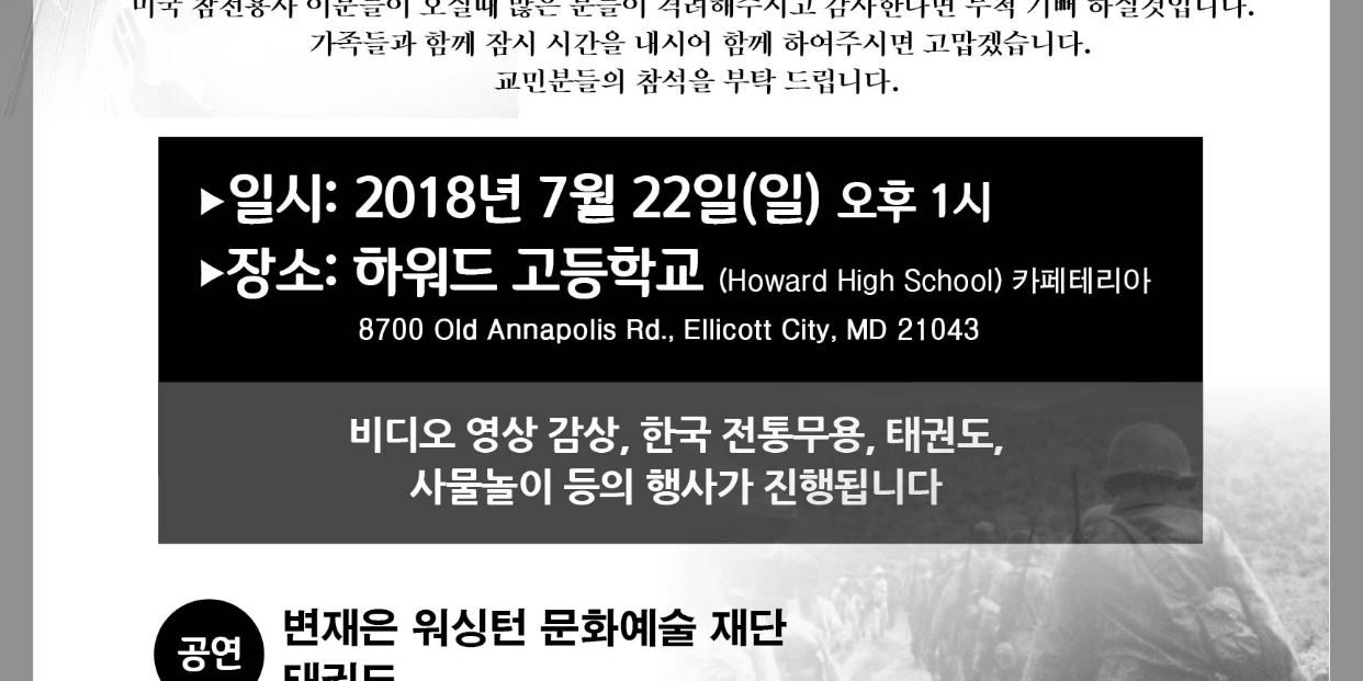 하워드 한인회에서는 대한민국 자유를 위해 싸우신 6.25 한국전쟁 용사분들 그리고 대한민국에 파병해준 미국참전용사들을 기억하고 감사하는 마음으로 아래 같이 보은 오찬 행사를 준비 하였습니다. 일시: 2018년 7월 22일(일) 오후 1시 장소: 하워드 고등학교 (Howard High School) 카페테리아 (Cafeteria) 8700 Old Annapolis Rd, Ellicott City, MD 21043 비디오 영상 감상, 한국 전통무용, 태권도, 사물놀이 등의 행사가 진행됩니다.