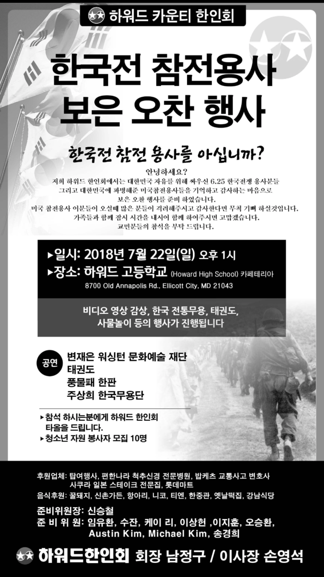 하워드 한인회에서는 대한민국 자유를 위해 싸우신 6.25 한국전쟁 용사분들 그리고 대한민국에 파병해준 미국참전용사들을 기억하고 감사하는 마음으로 아래 같이 보은 오찬 행사를 준비 하였습니다. 일시: 2018년 7월 22일(일) 오후 1시 장소: 하워드 고등학교 (Howard High School) 카페테리아 (Cafeteria) 8700 Old Annapolis Rd, Ellicott City, MD 21043 비디오 영상 감상, 한국 전통무용, 태권도, 사물놀이 등의 행사가 진행됩니다.